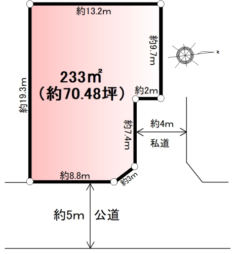 東側約5m公道・北側約4m私道 |